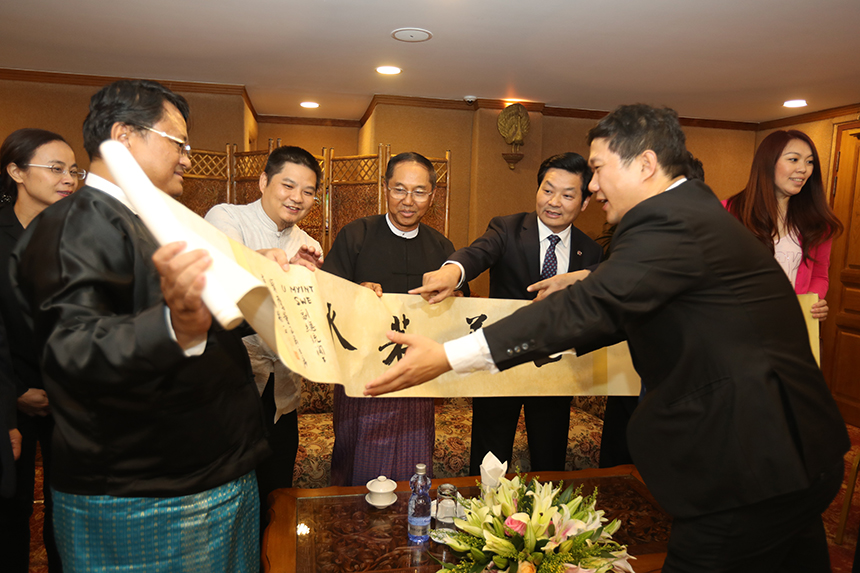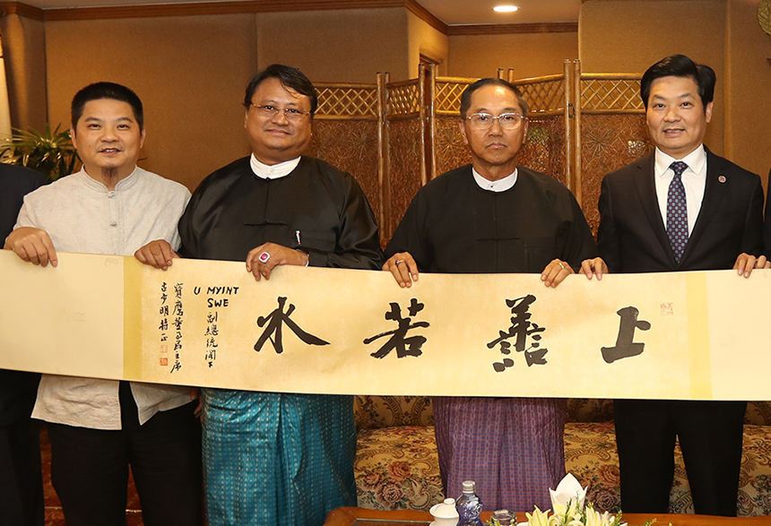 ▲寶鷹集團董事局主席古少明(右一)、副總裁古樸(左一)向吳敏瑞副總統(右二)贈送西泠印人王躍慶書法作品“上善若水”,左二為緬甸投資發展協會主席、KMA集團主席欽茂皚