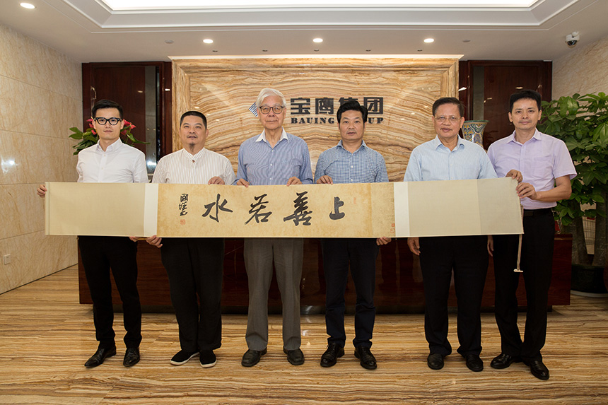▲古少明主席向鄧文中院士贈(zèng)送廣州美協(xié)主席周國(guó)城書法作品《上善若水》