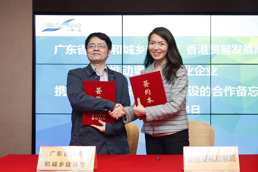 ▲廣東省住房和城鄉建設廳黨組成員、副廳長蔡瀛與香港貿易發展局華南首席代表吳文慧作為粵港雙方代表簽署《推動粵港建筑業企業攜手參與“一帶一路”建設的合作備忘錄》