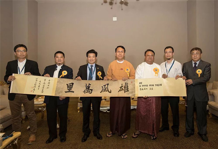 ▲寶鷹集團董事局主席古少明一行向仰光省省長吳漂敏登贈送西泠印人王躍慶書法作品“雄風萬里”