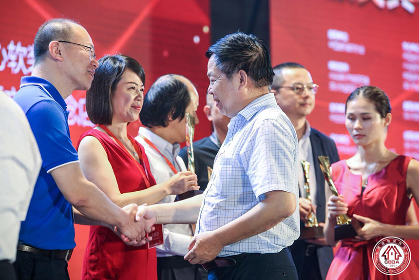 ▲ 寶鷹集團總裁成湘文為中國建筑裝飾設(shè)計獎金獎得主頒獎