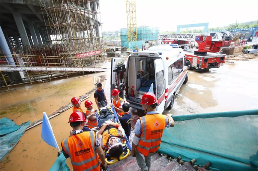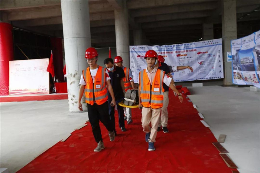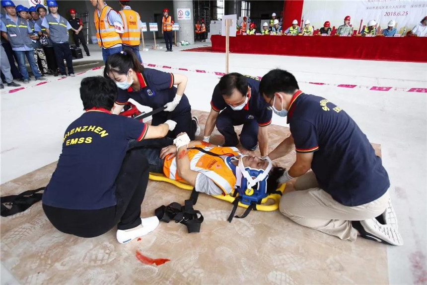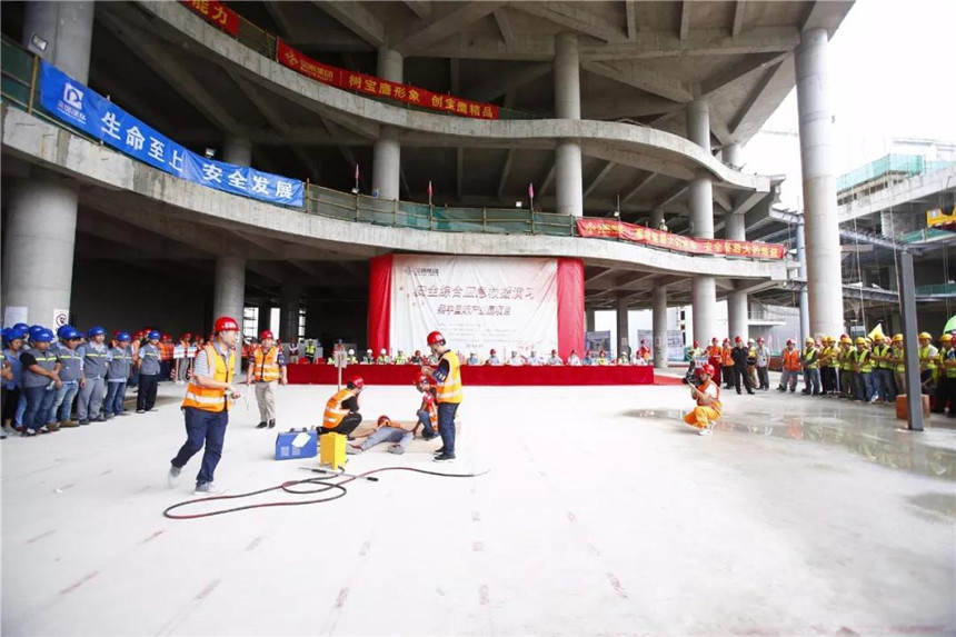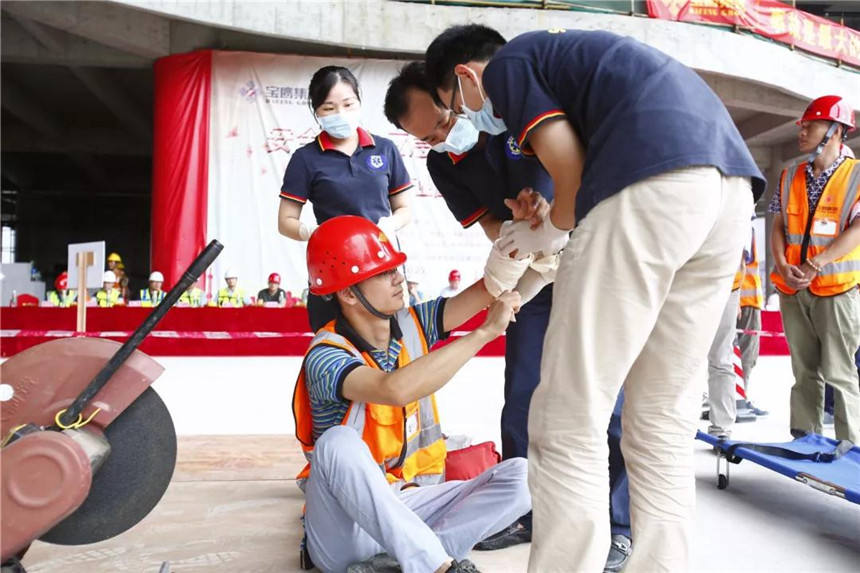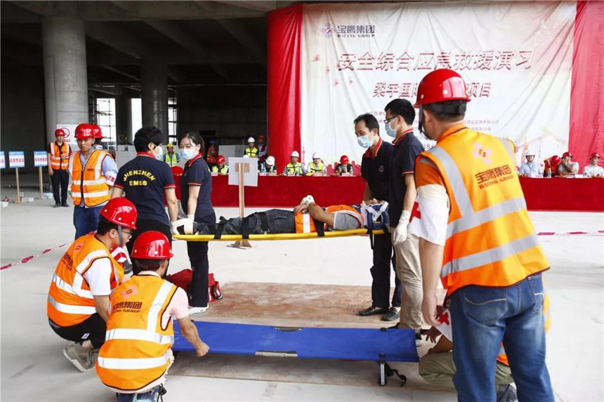 演習項目分為機械傷害演練、觸電傷害演練、高處墜落演練和消防疏散演練。來自寶鷹集團質安管理部、幕墻事業部和柔宇項目部的九十余名員工,分為安全通訊、疏散警戒、搶險救援、醫療救護等多組集結成隊,井然有序地參與演習。