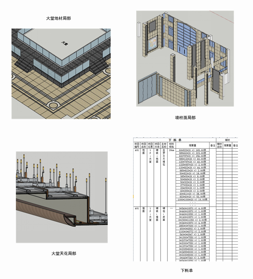 項目是由大堂、洽談區(qū)、辦公室、銷售休息室、衛(wèi)生間等幾個分區(qū)組成的銷售中心。該項目對地面鋪裝、墻柱面裝飾、天花吊頂裝飾三個板塊進行了建模及導出材料下料單。