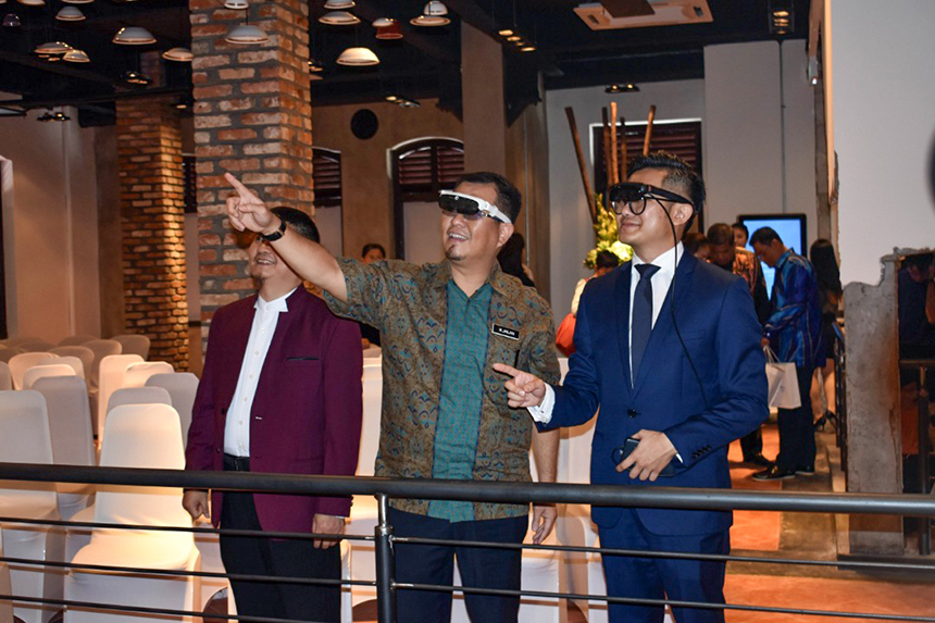 ▲馬六甲旅游、文化及遺產委員會主席莫哈末再拉尼(左二)與寶鷹集團副總裁古樸(左一)、太平洋未來科技CEO 李建億(右一)體驗AM Glass