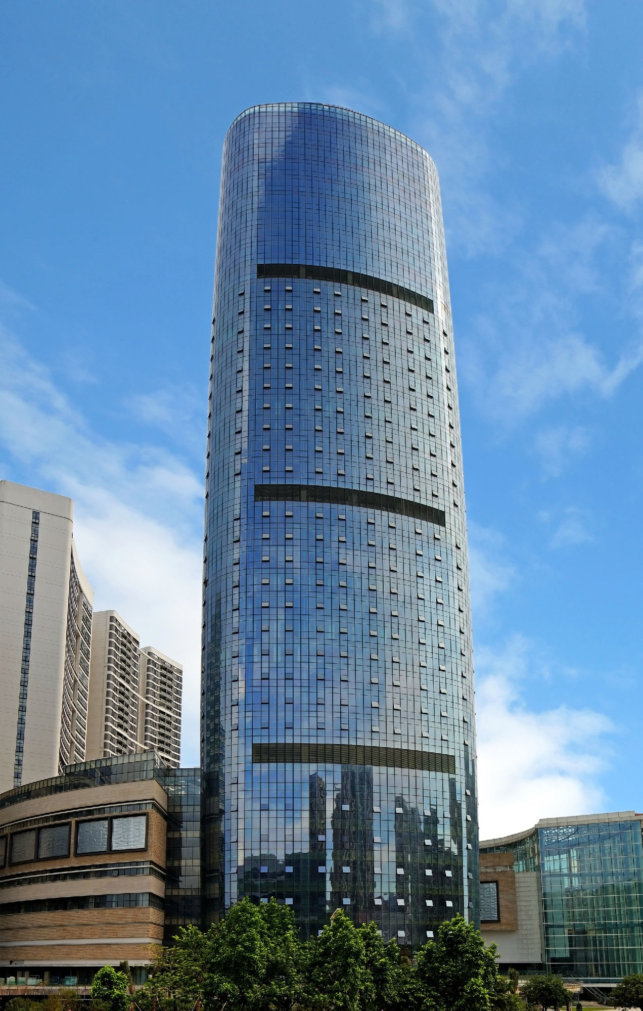 深圳有線信息傳輸大廈位于位于深圳市南山區濱海大道南側,環東路西側交匯處,臨近深圳南山高科技園區。項目工程總用地面積3024.3㎡,總建筑面積37622.9㎡。建筑幕墻最大標高為130.1m,玻璃幕墻總面積為32068㎡。本建筑工程性質為商業、廣播電視配套設施、郵電設施、辦公等綜合性的公共建筑。