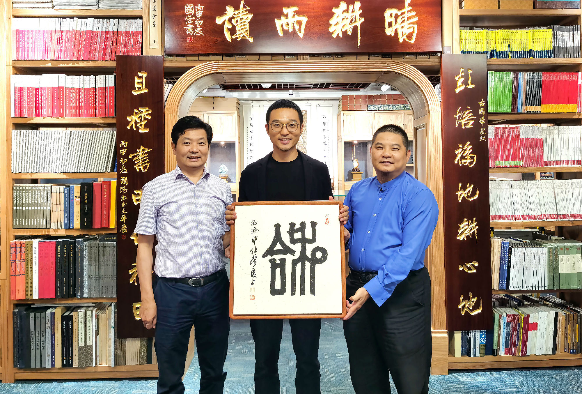 ▲寶鷹集團贈與陽光城集團深圳區域總裁吳樂寶鷹美術館館長王躍慶書法作品“和合”