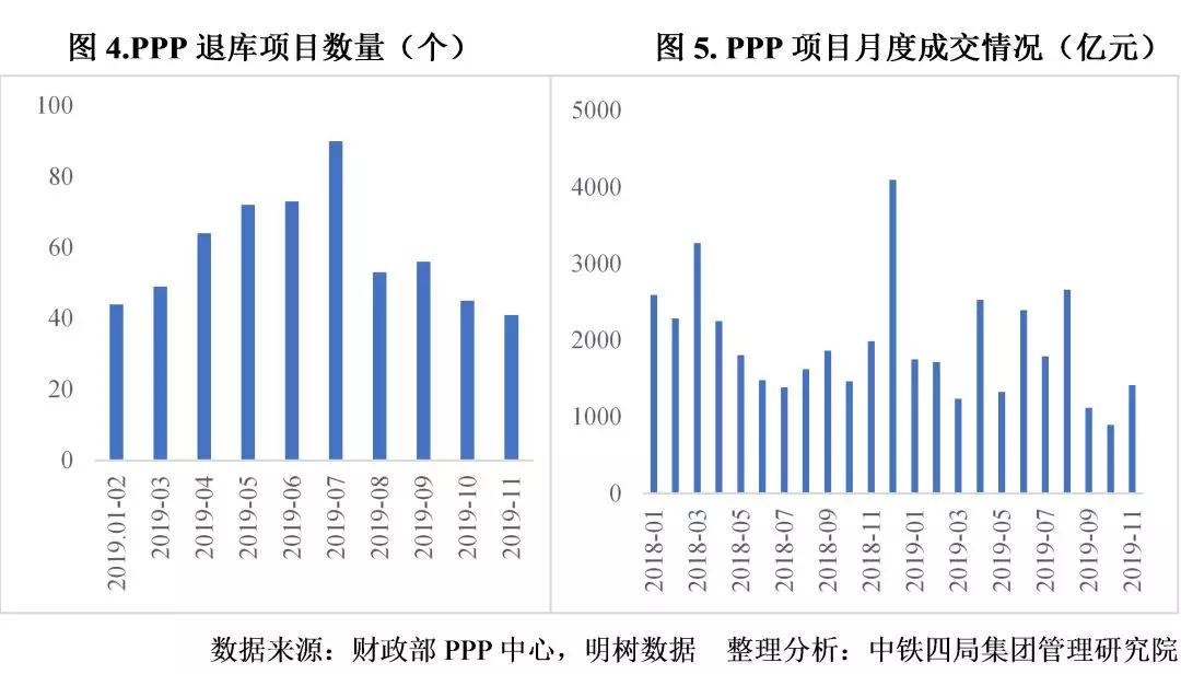 3.PPP延續高質量發展。從財政部PPP項目管理庫入庫情況看,2019年1-11月,管理庫凈入庫項目745個,投資額1.1萬億元。凈增項目數量和投資額均不足2018年同期的50%,但 落地率和開工率明顯提升。截至2019年11月,管理庫項目落地率為66.1%,較2018年底提升11.9個百分點;開工率達58.2%,較2018年底提升10.5個百分點。2019年下半年以來,PPP項目退庫情況較上半年有明顯減輕趨勢。前述情況表明,PPP項目質量不斷提升。見圖4、圖5。