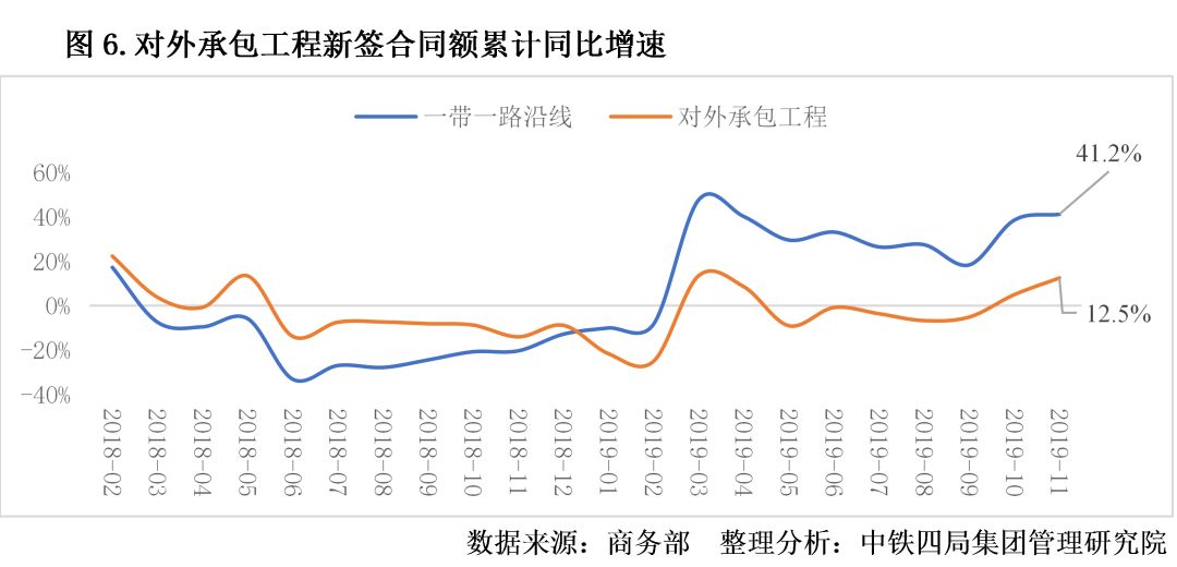 4.對外承包工程市場緩慢復蘇。2019年1-11月,我國對外承包工程累計完成新簽合同額2085.2億美元,實現營業額1349.7億美元,分別為2018年全年的86.2%、79.8%。對外承包工程市場下半年緩慢復蘇,截至11月新簽合同額同比增速提升至12.5%;營業額同比增速自5月起持續走低,截至11月增速為-2.2%。“一帶一路”沿線國家表現良好,2019年前11個月累計新簽合同額同比增速達41.2%,占對外承包工程比重高達61.2%,占比持續上升。見圖6。