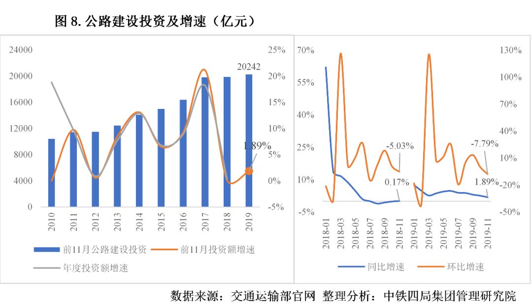 2.公路建設投資小幅回彈。2019年我國公路建設投資規模小幅增長,增速相較上年略有回升。2019年前11個月,我國公路建設累計完成投資20242.14億元,同比增長1.89%,已實現從2018年低點觸底回升,但增幅不及2012、2013年度。從月度數據來看,2019年同比增速從6月份開始轉好并保持穩定,但環比增速與2018年同期相比持續上下波動,2019年我國公路建設累計投資大概率回暖,但增長幅度有限。見圖8。