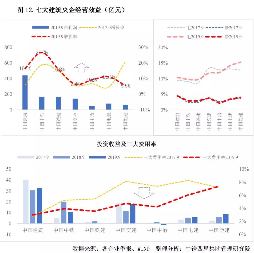 2.凈利潤增長與費用管控效果顯著。2019年前三季度,七大建筑央企中,中國建筑凈利潤為440.54億元,投資凈收益最高為32.39億元,均遠高于其他企業;中國中鐵的凈利潤增速高達26.7%,遠高于其他企業;除中國能建(5.5%)、中國交建(6.4%)、中國中冶(9.2%)以外,其他建筑央企凈利潤增速均超過10%。對比2017年和2019年前三季度的數據發現,各大建筑央企的毛利率變動方向不一致,凈利率變動不明顯。近三年來,除中國建筑和中國能建外,其他建筑央企的三大費用率明顯降低,其中中國交建降幅達3.38個百分點。見圖12。
