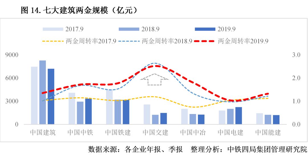 4.壓降“兩金”效果逐漸顯現。建筑業供給側改革背景下,建筑央企積極壓降“兩金”,效果初步顯現。2017年以來,各大建筑央企“兩金”周轉率結束下降趨勢,從2018年開始提升。從“兩金”規模來看,除中國電建外,其他建筑央企“兩金”總額都有所降低;從相對值來看,除中國電建和中國能建“兩金”周轉率變動不明顯外,其他建筑央企“兩金”周轉率都有明顯提升,其中中國交建提升幅度最大。見圖14。