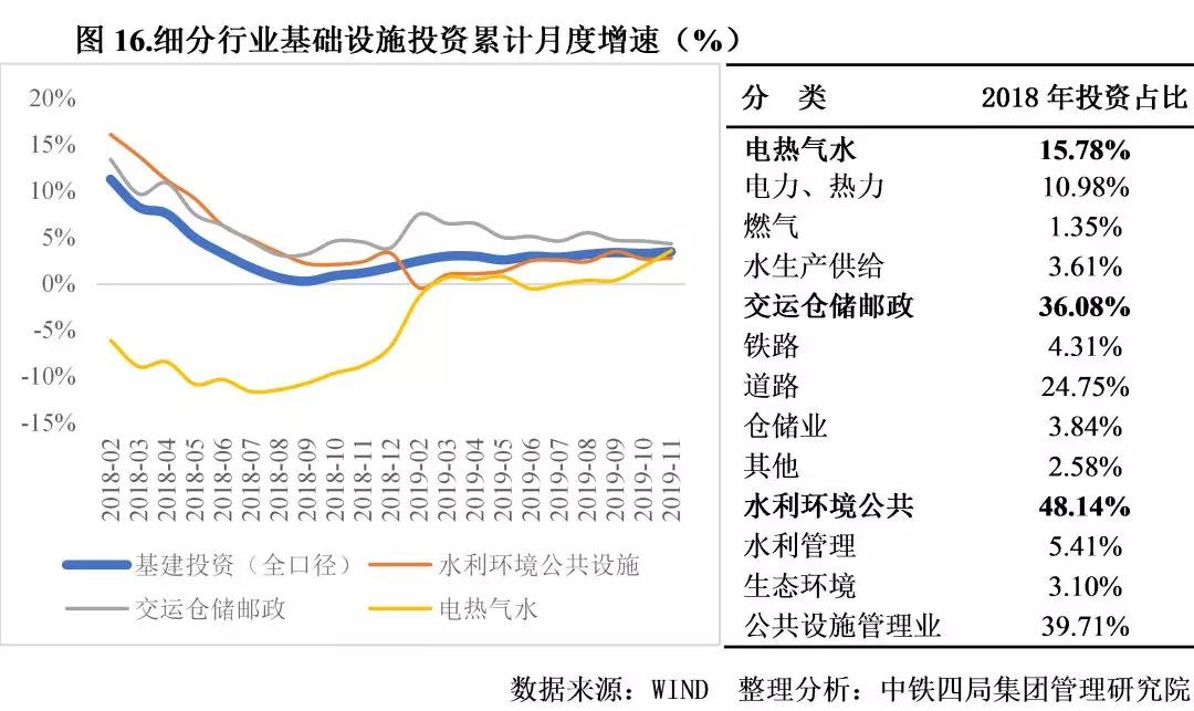 一是基建投資溫和回暖。隨著基建補短板政策陸續出臺,基建投資增速觸底反彈,自2018年9月起保持弱復蘇態勢。2019年12月中央經濟工作會議明確要求堅持穩字當頭,預計宏觀經濟政策逆周期調節下,基建將繼續發力。2019年9月國家提前下達部分2020年新增專項債限額1萬億元,且明確規定不得用于土地儲備和房地產相關領域,全年投向基建的專項債占比有望提高至60%,疊加項目最低資本金比例由25%下調為20%,專項債可作資本金參與項目投資等規定,基建投資增速將得到提升。交通和市政仍是核心發力點。2019年道路、鐵路、公路運輸建設投資的增長促進了基建投資的復蘇,下半年國家發布《西部陸海新通道總體規劃》《交通強國建設綱要》等重大政策,預計2020年交通運輸投資建設仍將是重點。公共設施管理業占基建投資的比重達40%,中央經濟工作會議明確提出將引導資金投向供需共同受益的民生建設等短板領域,加強市政管網、城市停車場、冷鏈物流的建設,預計2020年該領域投資將迎來新機遇。見圖16。