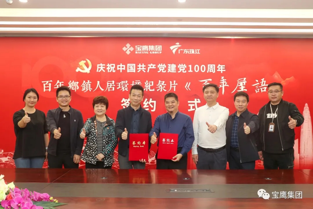 為慶祝中國共產黨建黨100周年,3月12日,由廣東廣播電視臺珠江頻道攜手深圳市寶鷹建設集團股份有限公司聯合制作的百年鄉鎮人居環境紀錄片《百年屋語》在寶鷹集團總部舉行簽約活動,借百年人居環境變化反映人民生活水平的提升。寶鷹集團黨委委員、總裁于泳波,黨委委員、常務副總裁古樸出席簽約活動。