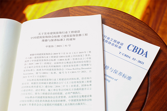 2021年9月,由寶鷹集團主編的中國建筑裝飾協會CBDA標準——《建筑裝飾裝修工程維修與保養標準》(T/CBDA 53-2021)正式實施。
