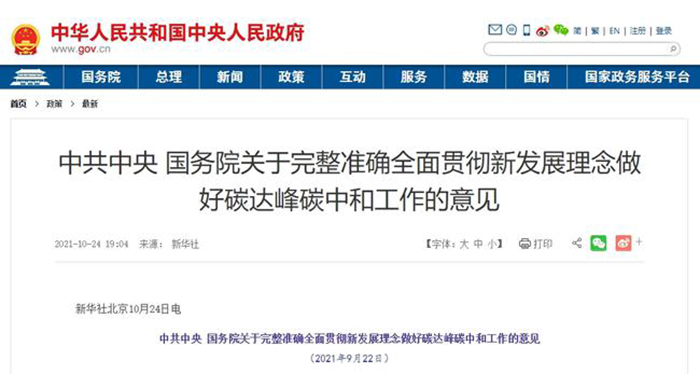 《關于完整準確全面貫徹新發展理念做好碳達峰碳中和工作的意見》提出: