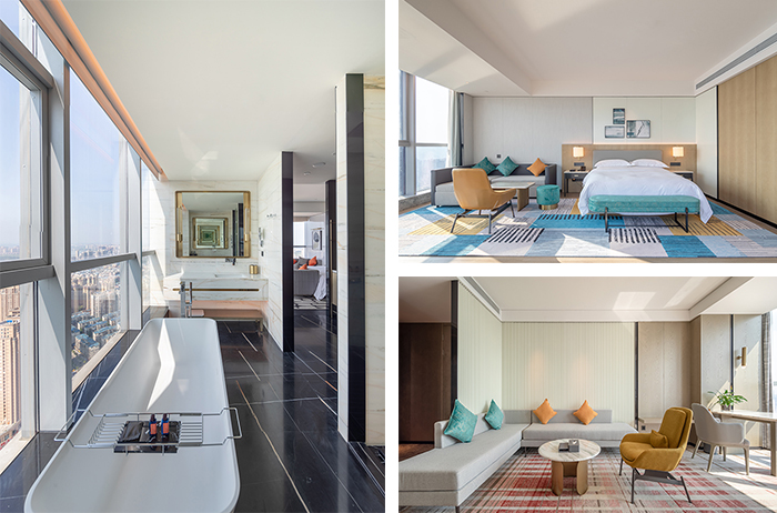 276間寬敞舒適客房,整體風格以現代輕奢為主。純粹率性的豎條打底墻面搭配精致燈具,淺白色的整體屋面配合墨綠和橘紅,讓人沉浸在整潔舒適、愉悅自在的氛圍之中。窗外,嘉陵江水波光粼粼,兩岸高低錯落的建筑和生態景觀盡收眼底,星級酒店氣質盡現。
