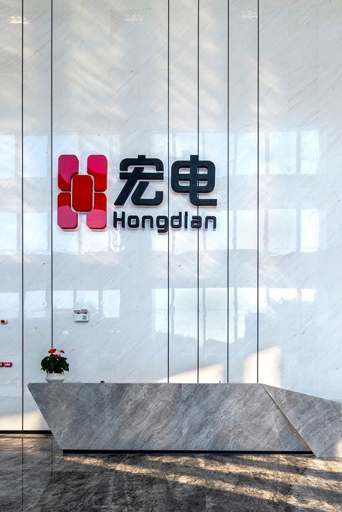 大堂作為企業最重要也是給客戶第一印象的空間,更應該是具有強烈的企業獨特性。宏電大廈在大堂的設計上摒棄了傳統的方式,化繁為簡,采用低碳綠色、高端簡約的設計理念,兼顧設計美學和可持續綠色的原則,采用超高空間、超大采光的立面裝飾,使大堂全天最大限度的接收自然光線的照射,為空間帶來純粹的視覺震撼。立柱和墻面選用白色大氣的環保石材,與地面平整光滑的深色搭配,一深一淺,勾勒出大廈整體低碳科技的主題色。