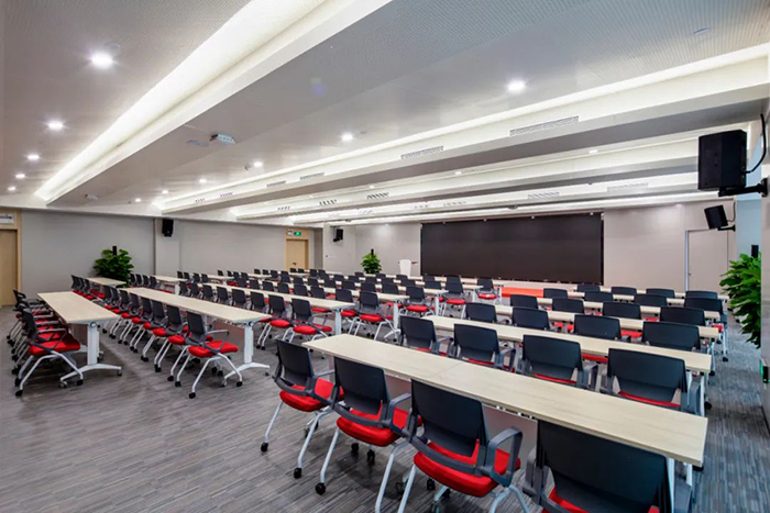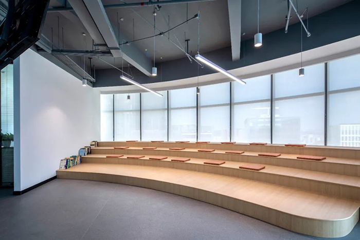 每層的辦公區域都搭配有休息區、學習區、運動區和會議室。合理的空間布局、多樣的娛樂休閑區、豐富的辦公儲物柜、靈活的辦公家具,宏電將人性化細節落實到對員工方方面面的關照之中。學習區采用階梯式的開放設計,配有高清LED屏,可進行各類學習交流活動。會議室以簡單實用為原則,大、中、小不同類型的會議室,滿足各類不同的會議需求。