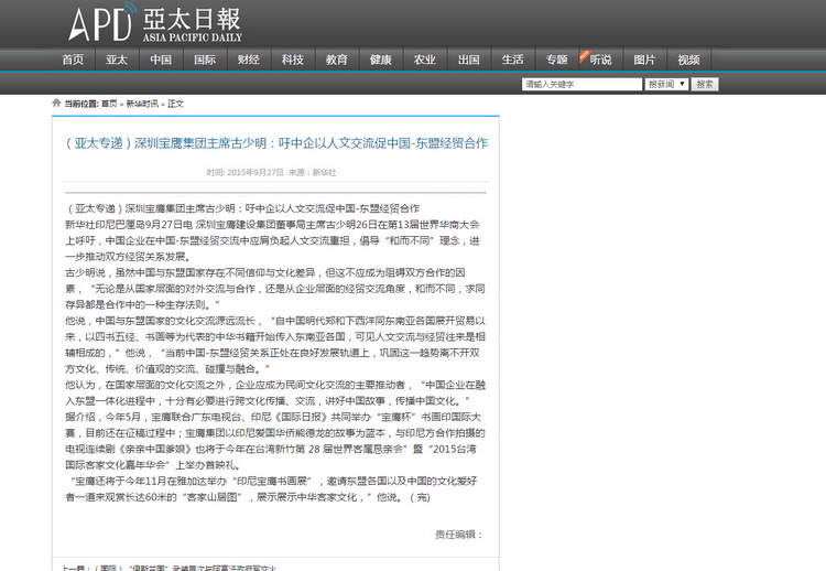 由新華社亞太總分社主辦的《亞太日報》以《深圳寶鷹集團主席古少明:吁中企以人文交流促中國-東盟經貿合作》為題,詳細報道了古少明主席在東盟區域一體化合作論壇上發表演講的主旨,并介紹了寶鷹集團以人文促進國際文化交流的實際業績。