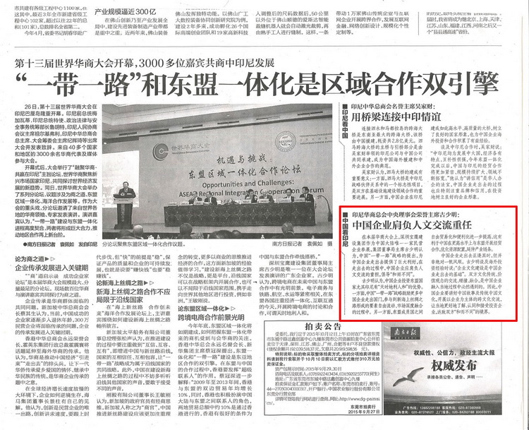 廣東省省委機關報、主流嚴肅大報《南方日報》在要聞版報道第十三屆世界華商大會時,以《中國企業要肩負人文交流為重任》為題闡述了古少明主席在東盟一體化論壇演講中提出的中國企業在走出去的過程中應肩負人文交流重任的的觀點。