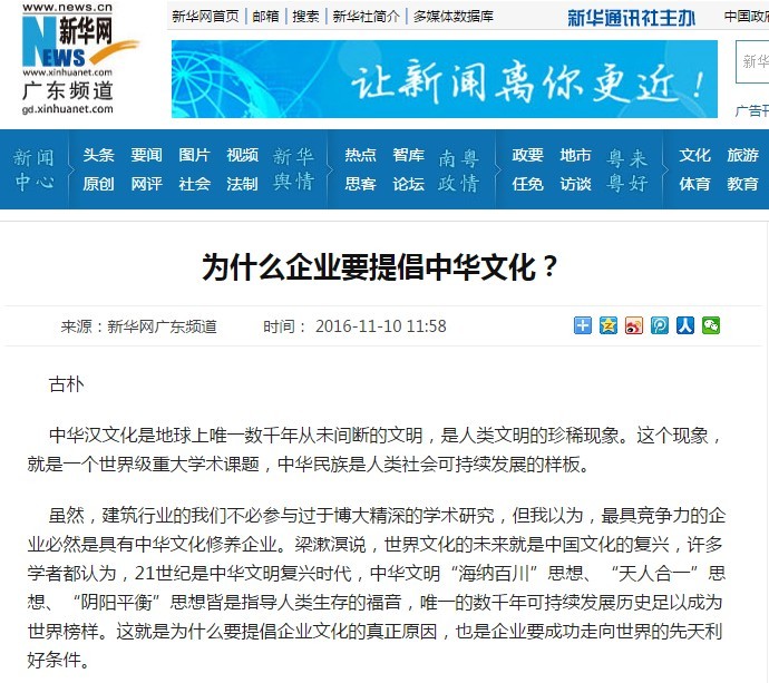 雖然,建筑行業(yè)的我們不必參與過(guò)于博大精深的學(xué)術(shù)研究,但我以為,最具競(jìng)爭(zhēng)力的企業(yè)必然是具有中華文化修養(yǎng)企業(yè)。梁漱溟說(shuō),世界文化的未來(lái)就是中國(guó)文化的復(fù)興,許多學(xué)者都認(rèn)為,21世紀(jì)是中華文明復(fù)興時(shí)代,中華文明“海納百川”思想、“天人合一”思想、“陰陽(yáng)平衡”思想皆是指導(dǎo)人類生存的福音,唯一的數(shù)千年可持續(xù)發(fā)展歷史足以成為世界榜樣。這就是為什么要提倡企業(yè)文化的真正原因,也是企業(yè)要成功走向世界的先天利好條件。