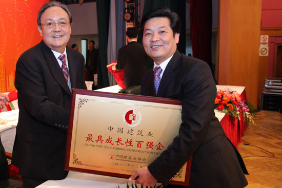 中國建筑業協會鄭一軍會長(原國家建設部副部長)向古少明主席頒發“中國建筑業最具成長性百強企業”獎牌