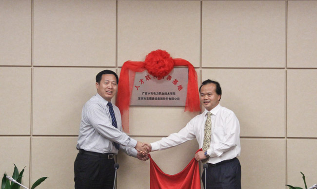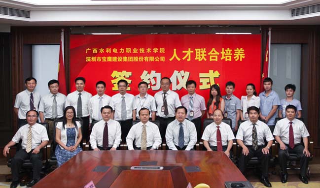 2012年7月8日,深圳市寶鷹建設(shè)集團(tuán)股份有限公司(下簡稱“寶鷹集團(tuán)”)與 廣西 水利電力職業(yè)技術(shù)學(xué)院(下簡稱“廣西水電學(xué)院”)人才聯(lián)合培養(yǎng)簽約儀式暨人才聯(lián)合培養(yǎng)基地揭牌儀式在寶鷹集團(tuán)總部隆重舉行。廣西水電學(xué)院院長、教授、高級工程師劉延明,副院長、博士生導(dǎo)師、教授黃偉軍等及寶鷹集團(tuán)常務(wù)副總裁許平、董事長助理古德、副總裁古樸等領(lǐng)導(dǎo)出席了儀式。