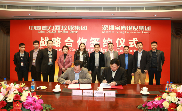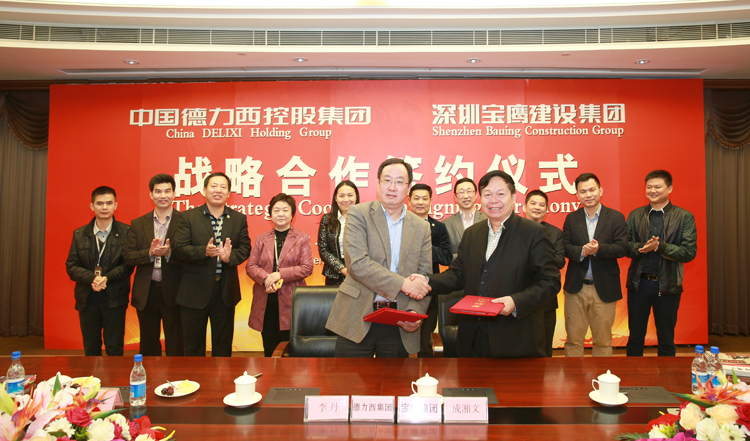 中國德力西控股集團執行副總裁李丹與寶鷹集團總裁成湘文正在簽訂合作協議