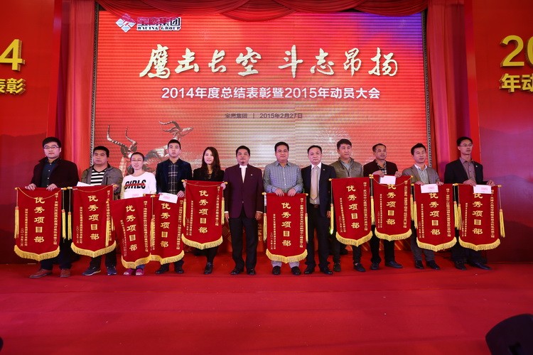 2015 年 2 月 27 日,寶鷹集團 2014 年度總結表彰暨 2015 年動員大會于深圳香蜜湖盛大舉行。寶鷹集團董事局主席古少明、監事會主席胡蘭萍、董事長古少波及其他領導班子成員、寶鷹集團各位股東、股東代表,寶鷹集團各位董事、獨立董事,寶鷹集團全體同仁出席了此次大會。此外,此次大會還邀請了深圳裝飾行業協會會長高剛、副會長莊志偉、副秘書長王彥波,深圳市公安局經濟犯罪偵查局副局長林顯運,中建南方董事長劉慧永、總經理張玨、常務副總經理嚴美文等嘉賓。寶鷹集團常務副總裁許平主持大會。