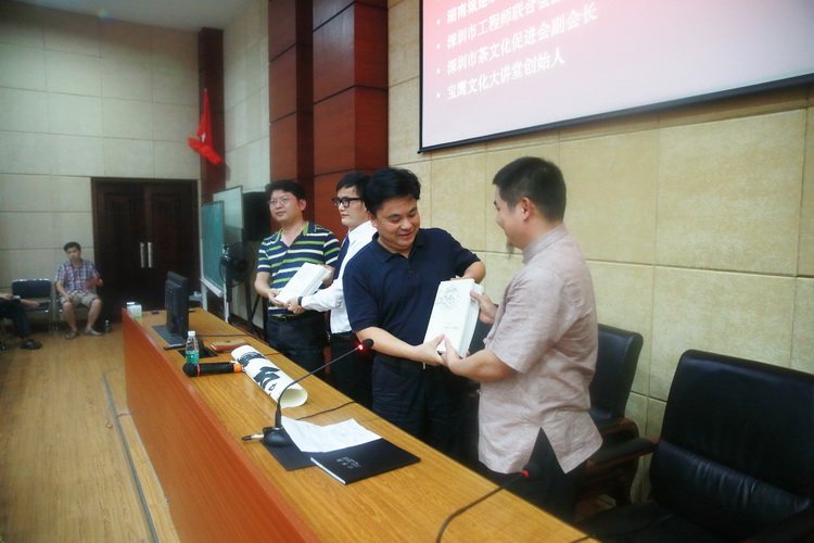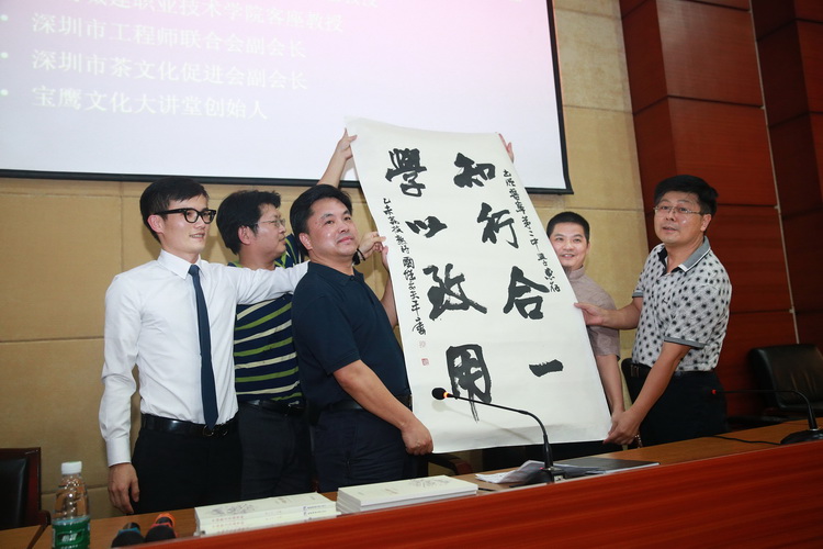 當(dāng)天下午,雖然艷陽高照、氣溫飆升,但是普寧二中老校區(qū)淑嫻樓二樓的多功能廳里卻座無虛席,大家對古樸副總裁的到來都充滿了期待。當(dāng)身穿唐裝的古樸副總裁出現(xiàn)在多功能廳時,現(xiàn)場響起了熱烈的掌聲。古樸副總裁首先向溫校長捐贈了廣州市美術(shù)家協(xié)會主席、著名書畫家周國城先生特別題贈給普寧二中的墨寶“知行合一、學(xué)以致用”和收錄了自己的散文《安靜與力量》一文的《中國散文名篇賞析》一書。隨后,古樸副總裁為現(xiàn)場的師生作了題為“知行合一、學(xué)以致用”的文化專題講座。