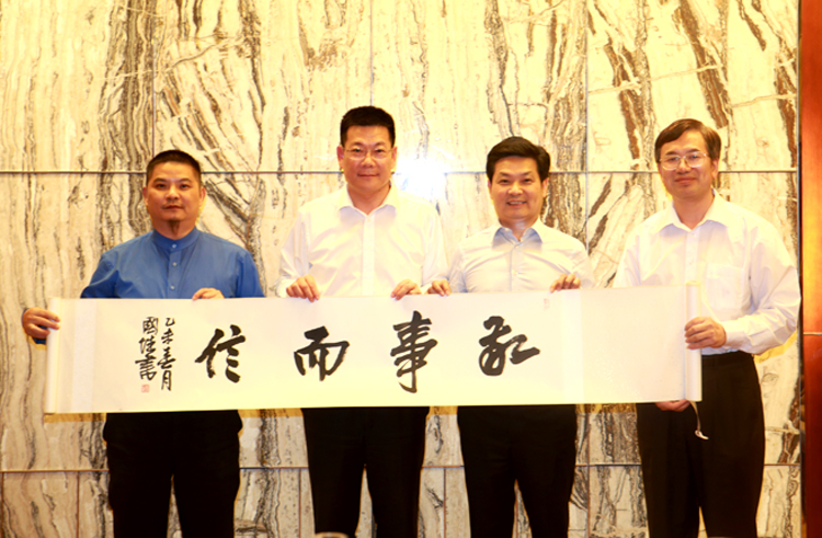 左二:廣東外語外貿大學校長仲偉合 右二:寶鷹集團董事局主席古少明 右一廣東外語外貿大學副校長何傳添,左一:寶鷹集團副總裁古樸
