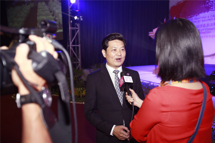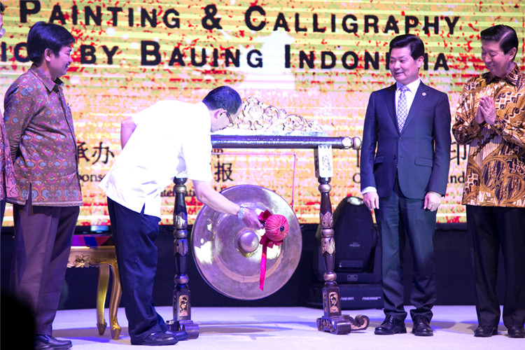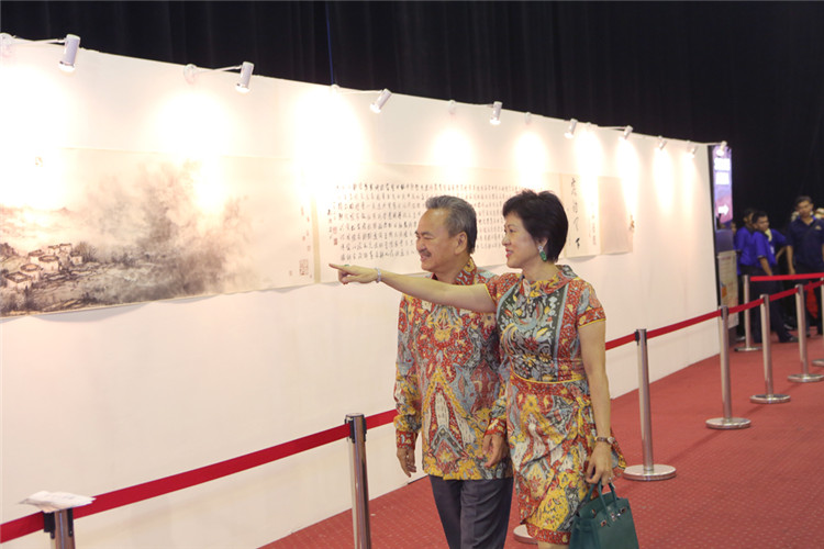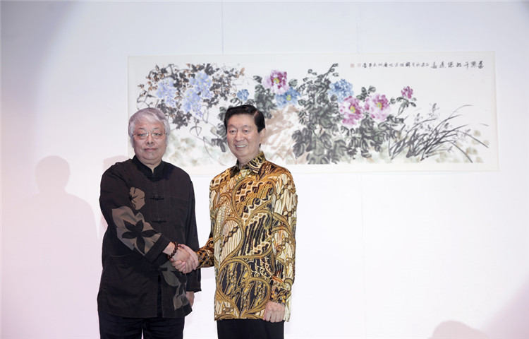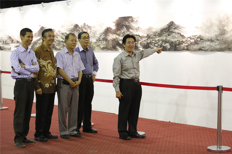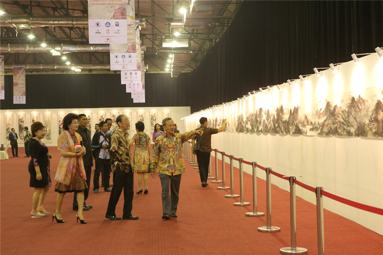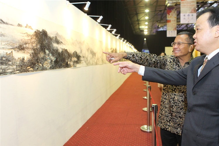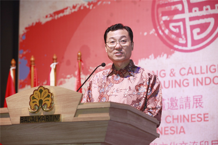 謝鋒還表示,藝術(shù)是聯(lián)結(jié)世界、溝通民心的橋梁。正如蠟染和木雕是印尼人民引以為傲的藝術(shù)瑰寶,水墨畫和書法承載著華夏五千年厚重文明,體現(xiàn)了中國美術(shù)的精髓,色彩看似單調(diào),意境豐富悠遠,凝聚了中華民族的智慧、性格和情感。希望此次書畫展能夠為印尼人民打開一扇感受中國文化的窗口,增進兩國人民的相互了解和友誼。