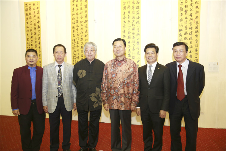 ▲印尼旅游部長阿利耶夫(右二)蒞臨書畫展開幕式,與古少明主席(左一)、廣東外語外貿(mào)大學副校長何傳添(左二)、李大西博士(右一)合影