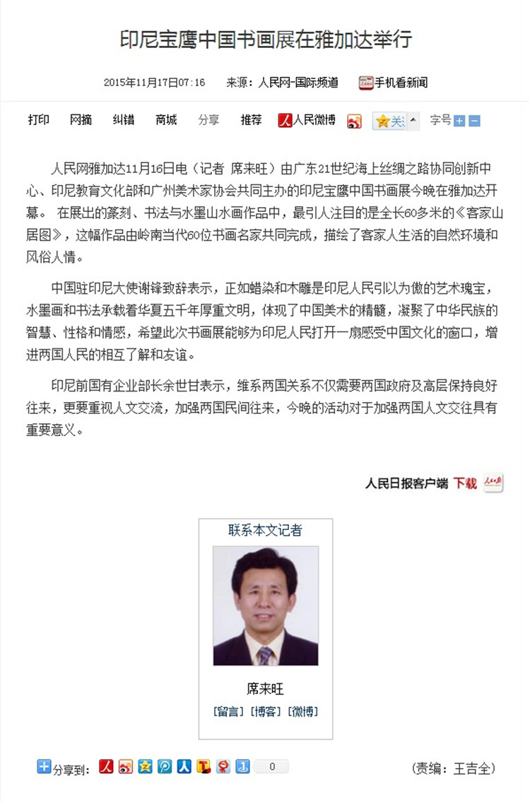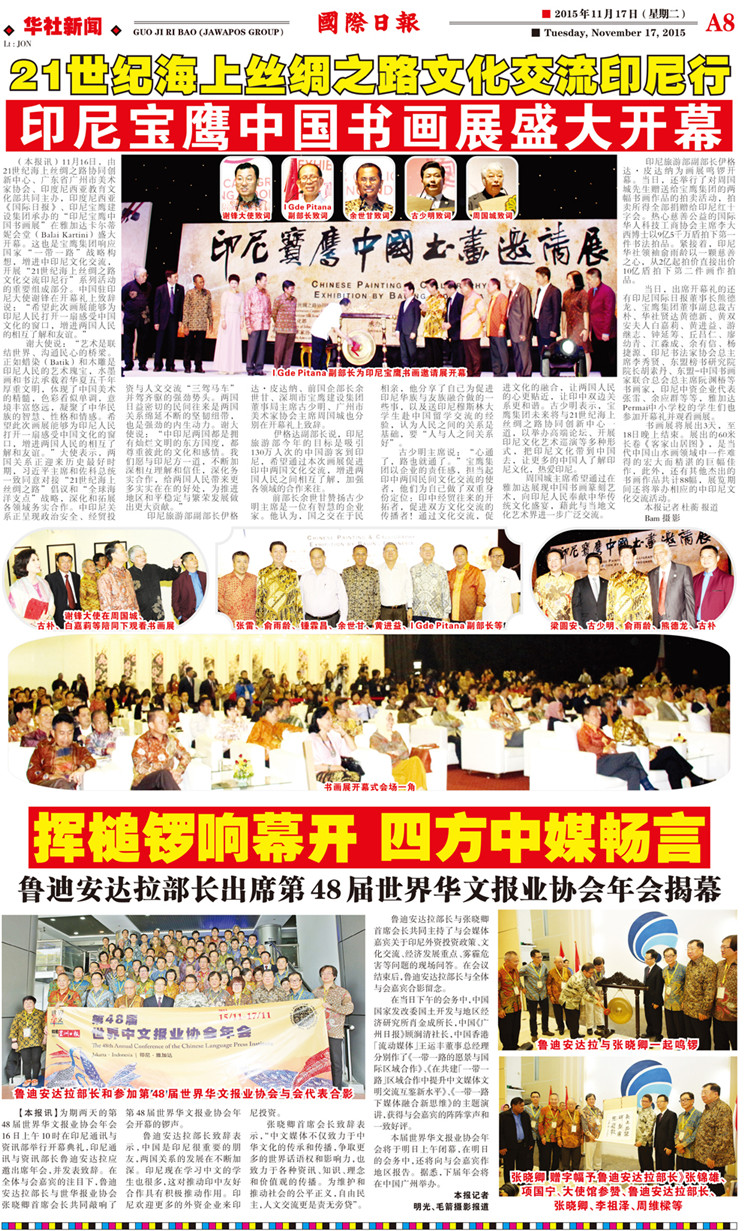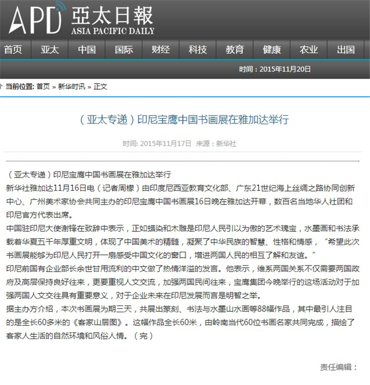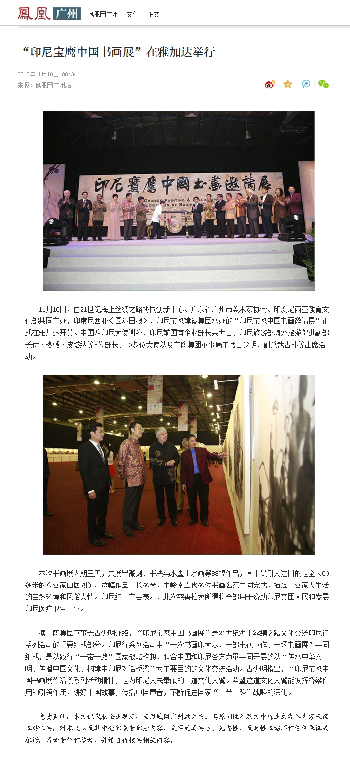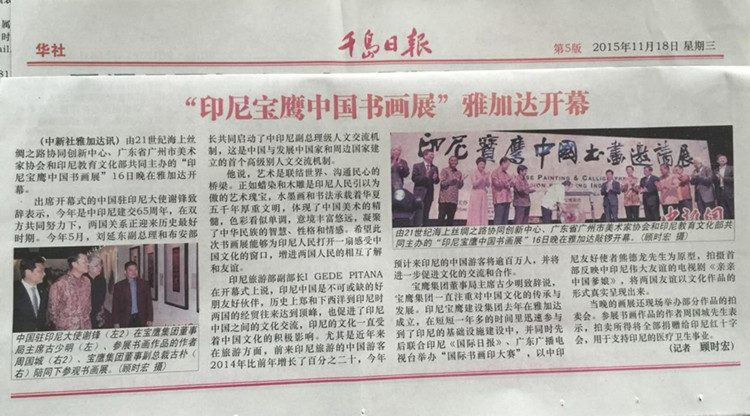 11月16日晚--18日,由21世紀海上絲綢之路協(xié)同創(chuàng)新中心、廣東省廣州市美術(shù)家協(xié)會和印尼教育文化部共同主辦,寶鷹集團、印尼《國際日報》承辦,印尼旅游部協(xié)辦的“印尼寶鷹中國書畫展”在印度尼西亞雅加達卡爾蒂妮宮盛大舉行。