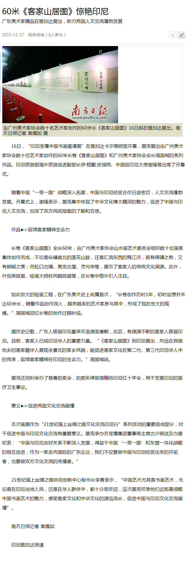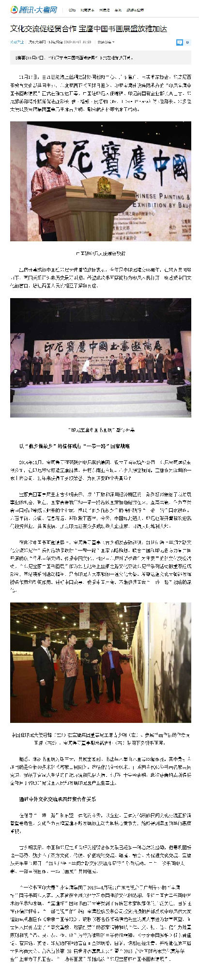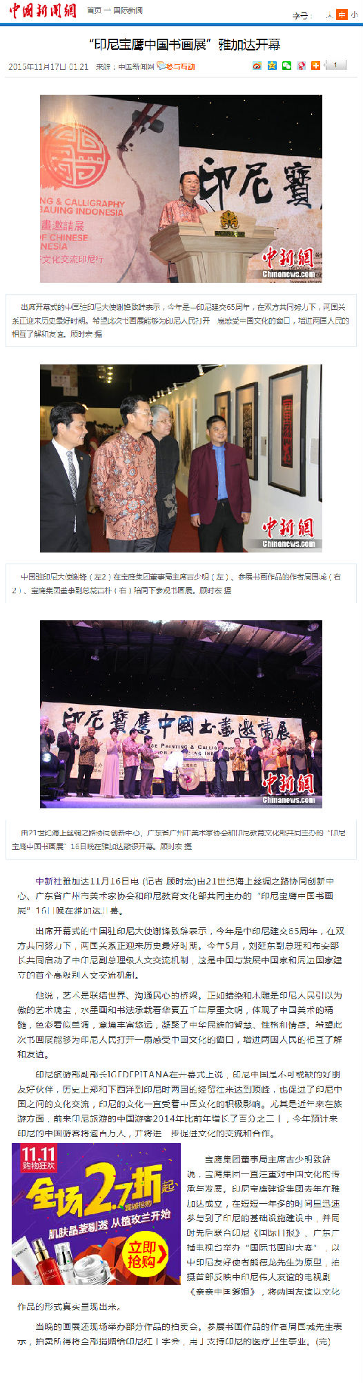 11月16日晚--18日,由21世紀海上絲綢之路協(xié)同創(chuàng)新中心、廣東省廣州市美術(shù)家協(xié)會和印尼教育文化部共同主辦,寶鷹集團、印尼《國際日報》承辦,印尼旅游部協(xié)辦的“印尼寶鷹中國書畫展”在印度尼西亞雅加達卡爾蒂妮宮盛大舉行。