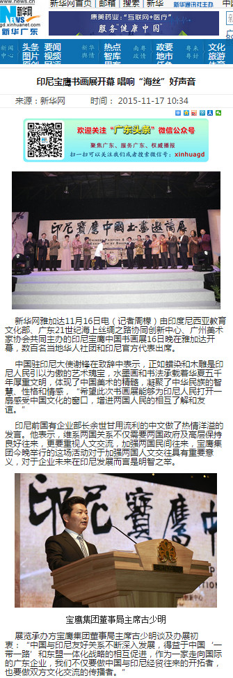 請點擊以下鏈接觀看深圳衛(wèi)視《深視新聞》欄目對印尼寶鷹書畫邀請展的報道: http://www.cutv.com/v2/2015-11-17/G16ghgggihkknnllhmh9g6.shtml?from=timeline&isappinstalled=0