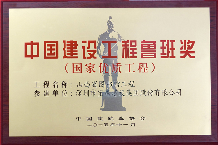 11月17日,2014~2015年度中國建設(shè)工程魯班獎(jiǎng)(國家優(yōu)質(zhì)工程)表彰大會(huì)于北京盛大舉行,大會(huì)向獲獎(jiǎng)單位頒發(fā)了獲獎(jiǎng)證書、獎(jiǎng)牌及魯班金像。寶鷹集團(tuán)參建的武漢國際博覽中心會(huì)議中心工程和山西圖書館工程獲得了中國建設(shè)工程魯班獎(jiǎng)。