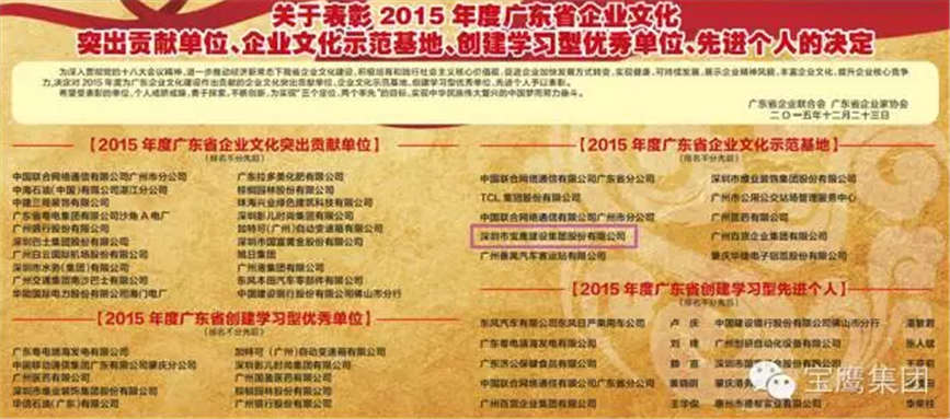 月初,為深入貫徹黨的十八大會議精神,進一步推動經濟新常態下廣東省企業文化建設,積極培育和踐行社會主義核心價值觀,促進企業加快發展方式轉變,實現健康、可持續發展,展示企業精神風貌,豐富企業文化,提升企業核心競爭力,廣東省企業聯合會、廣東企業家協會對2015年度為廣東企業文化建設作出貢獻的企業文化突出貢獻單位、企業文化示范基地、創建學習型優秀單位、先進個人予以表彰。寶鷹集團獲評“廣東省企業文化示范基地”榮譽稱號,廣東省共10家企業獲此殊榮,這也是寶鷹集團第三次獲得該項榮譽。