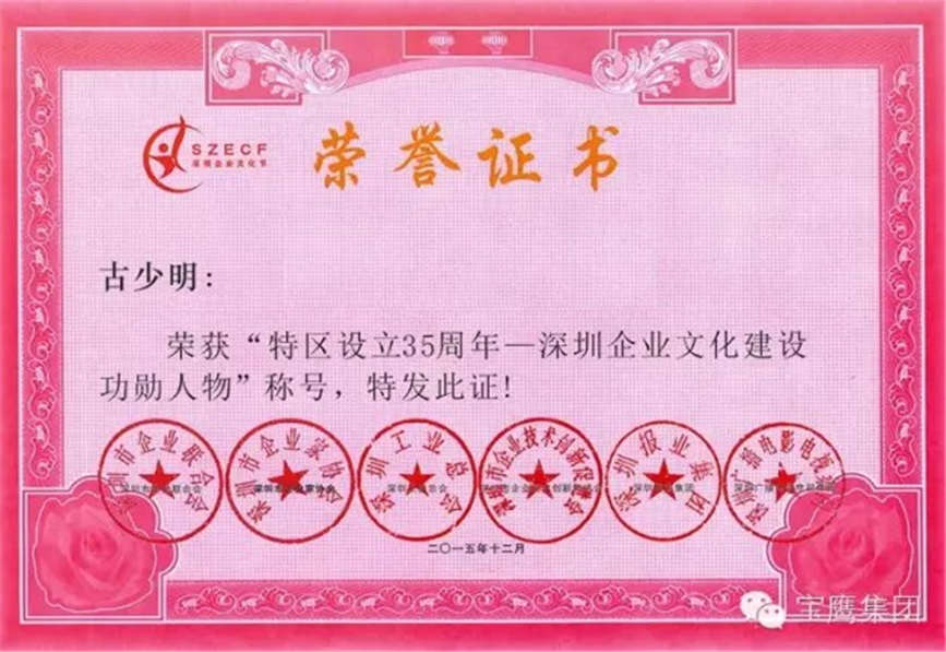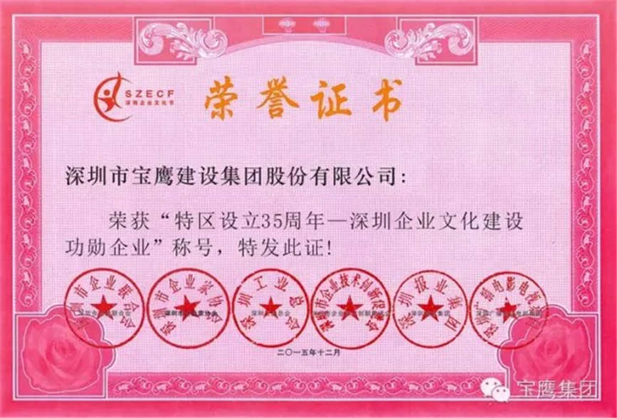 ▲寶鷹集團獲得“特區設立35周年-深圳企業文化建設功勛企業”獎