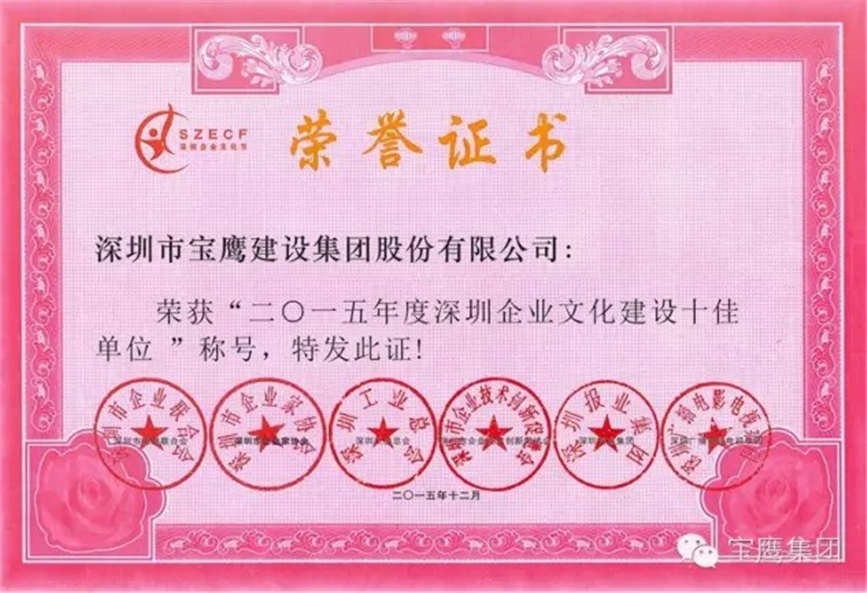 ▲寶鷹集團獲得“二〇一五年度深圳企業文化建設十佳單位”獎
