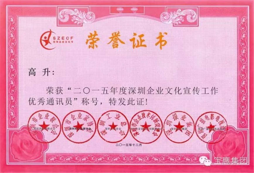 ▲文化品牌部主管高升獲得“二〇一五年度深圳企業文化宣傳工作優秀通訊員”獎