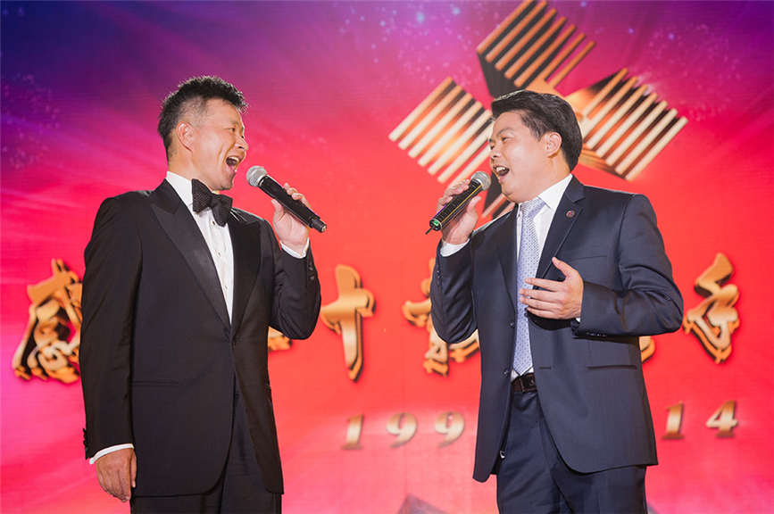 ▲寶鷹股份董事長古少波與著名歌手王宏偉同臺獻歌寶鷹20周年