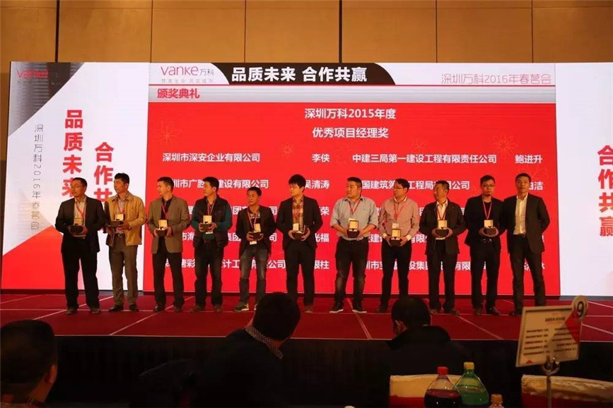 ▲寶鷹集團(tuán)獲得深圳萬(wàn)科2015年度卓越品質(zhì)獎(jiǎng)(上圖中為工程四部負(fù)責(zé)人陳東才)