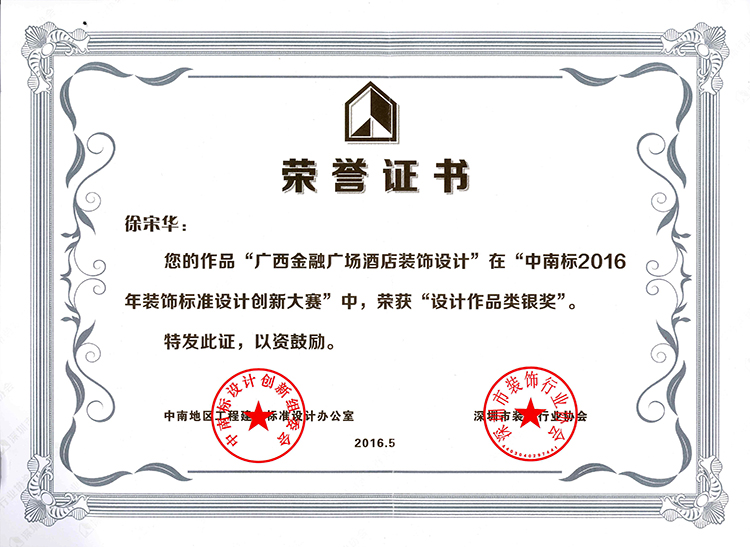 徐宗華《廣西金融廣場(chǎng)酒店裝飾設(shè)計(jì)》榮獲設(shè)計(jì)作品銀獎(jiǎng)