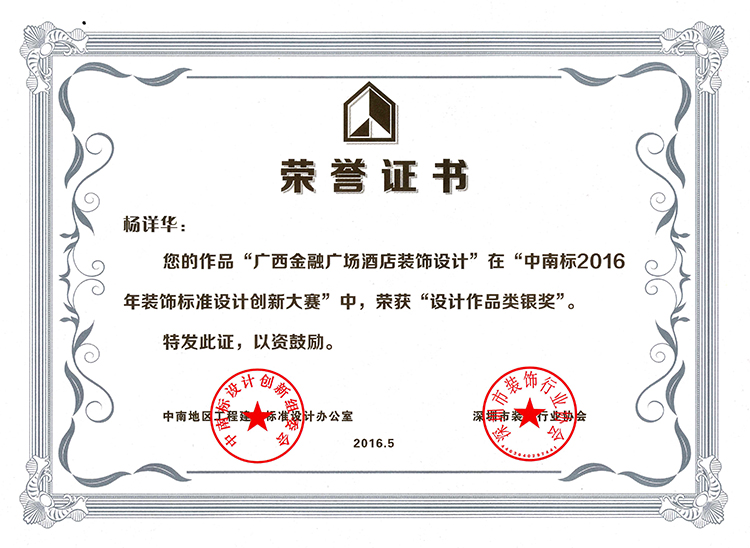 楊詳華《廣西金融廣場(chǎng)酒店裝飾設(shè)計(jì)》榮獲設(shè)計(jì)作品銀獎(jiǎng)