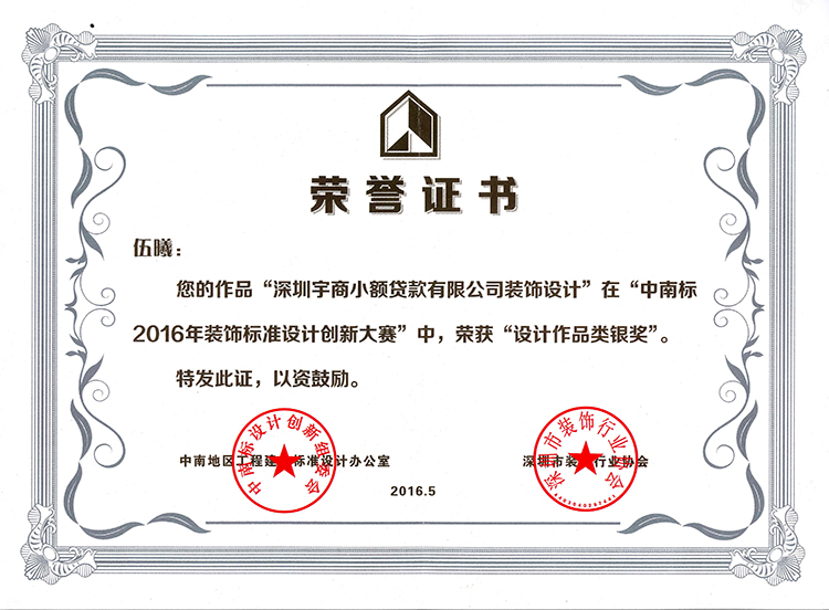 伍曦《深圳宇商小額貸款有限公司裝飾設(shè)計(jì)》榮獲設(shè)計(jì)作品銀獎(jiǎng)