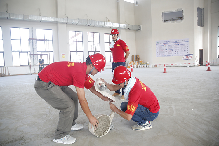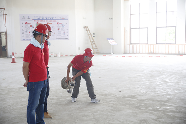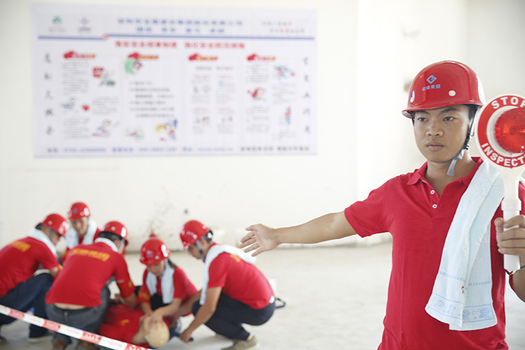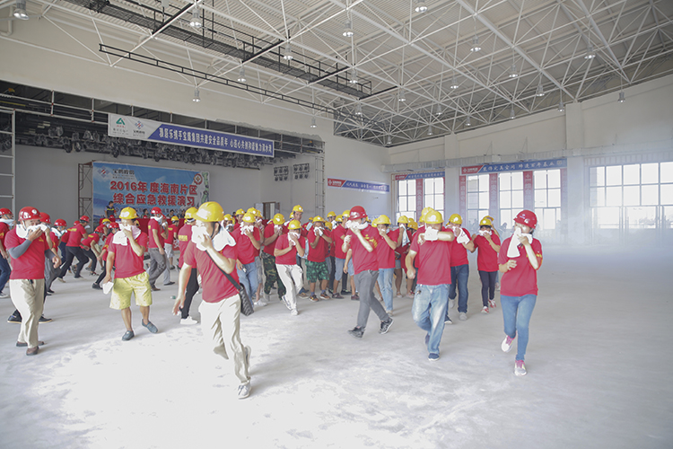 演習項目分為防臺風演習、防雨汛演習、消防疏散演習三個大項,分別模擬了觸電、中暑、火災、暴雨臺風等工地常見的突發安全事件和海南當地常發的自然氣象災害。在觸電事件發生后,演練人員封鎖事件現場、撥打120急救熱線、按照正確的自救方法對傷員進行救治,迅速報告項目安全人員,同時等待專業救助人員前來救治。在火災發生后,現場濃煙密布,演練人員迅速自發分為三隊從安全通道有秩序地撤離現場。暴雨、中暑等演練亦遵循各自的特點,在模擬實戰中為觀摩人員獻上豐富的一課。在滅火演練中,寶鷹集團總裁成湘文上陣為觀摩者示范了消防設備的使用方法。