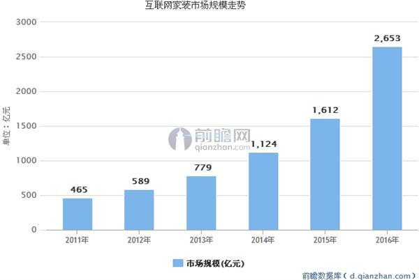 前瞻產(chǎn)業(yè)研究院發(fā)布的《互聯(lián)網(wǎng)家裝行業(yè)分析報告》指出,目前互聯(lián)網(wǎng)家裝仍在萌芽狀態(tài),互聯(lián)網(wǎng)家裝僅占整體行業(yè)的3.8%,與傳統(tǒng)家裝對比懸殊。但家裝行業(yè)作為一項重資產(chǎn)、高客單價的行業(yè),在國內(nèi)有著萬億級別的市場,在互聯(lián)網(wǎng)的大潮沖擊下,早早就開始了轉(zhuǎn)型,然而由于行業(yè)本身鏈條冗長,創(chuàng)新速度較慢,早起的市場發(fā)展增速并不快,從2014年始互聯(lián)網(wǎng)家裝開始收到資本重視,2015融資潮再次爆發(fā),市場規(guī)模達到1612億元,預(yù)計在今年市場規(guī)模將達到2653億。